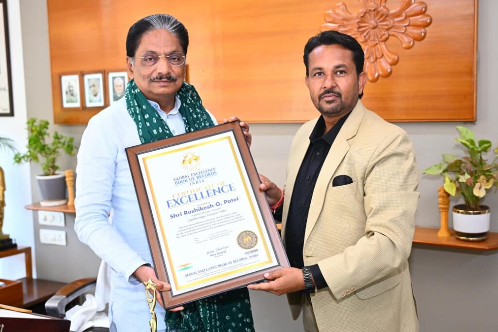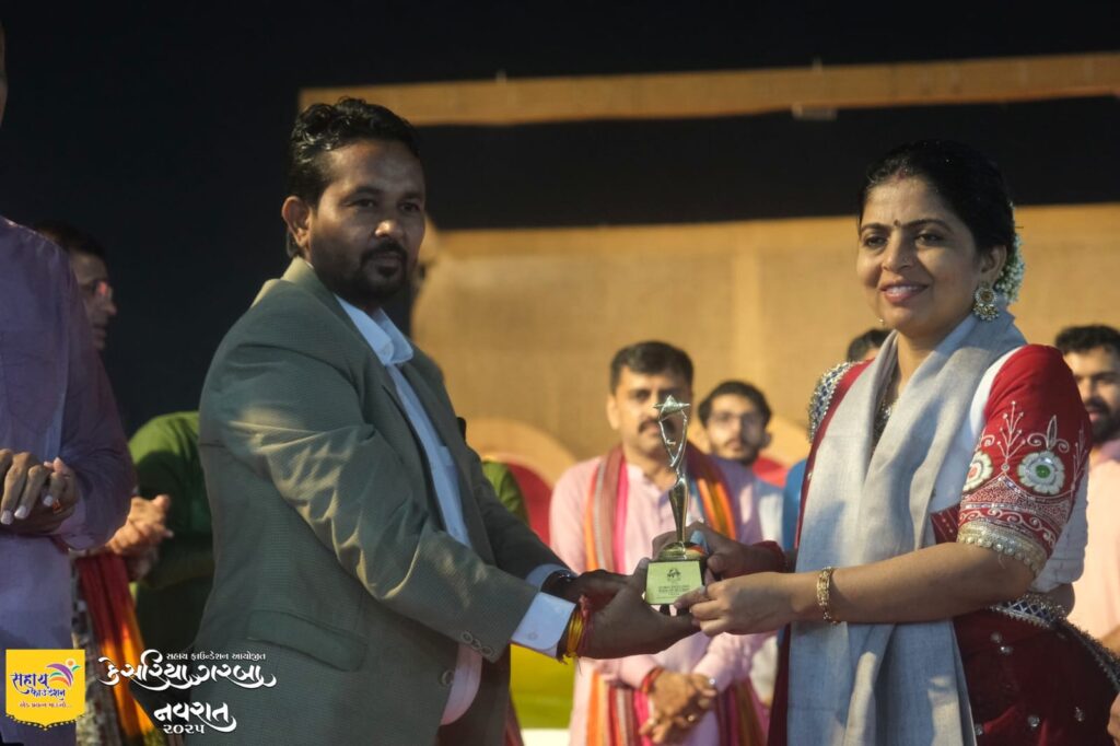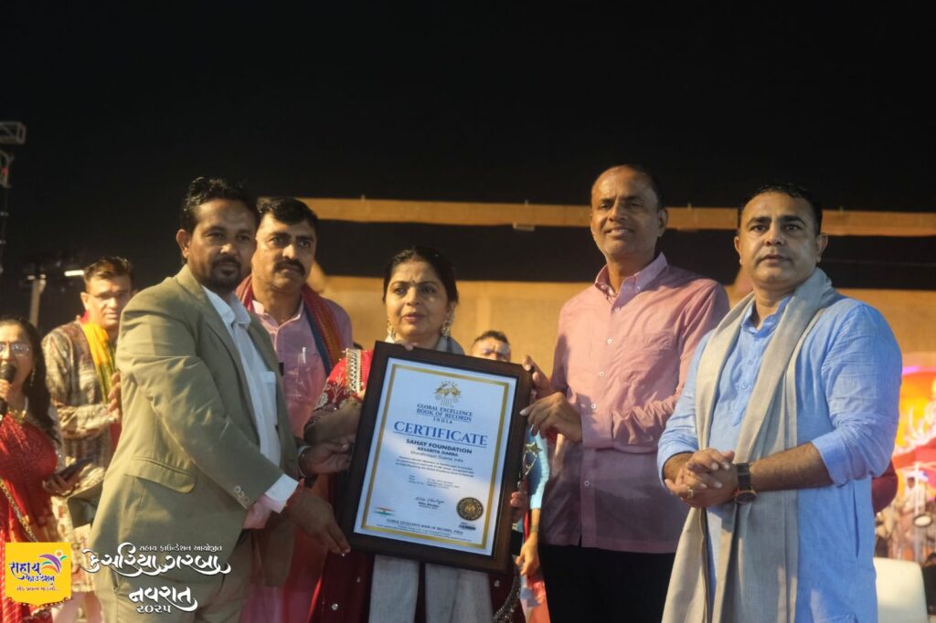 “You were honored with an India Record certificate by the Global Excellence Book of Records for performing the Aarti with 50,000 lamps during the Kesariya Navratri Mahotsav, presented by Honorable MLA Smt. Ritaben Patel of Gandhinagar.”